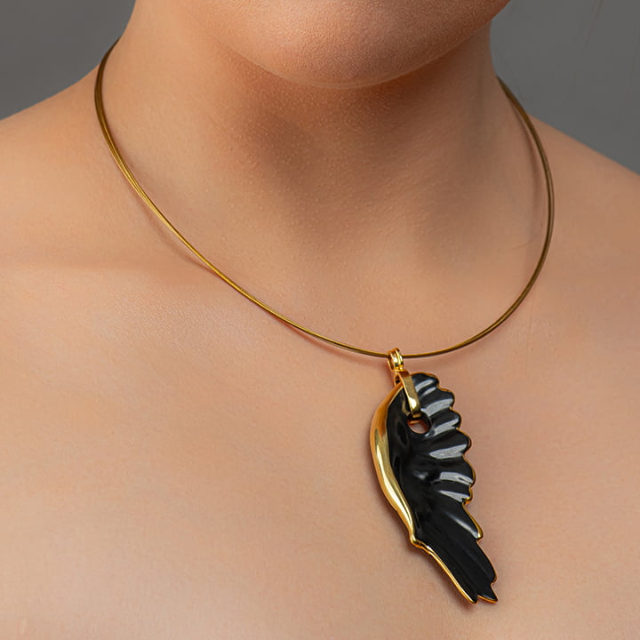 Čierno – zlatý prívesok z jemného porcelánu s anjelským krídlom